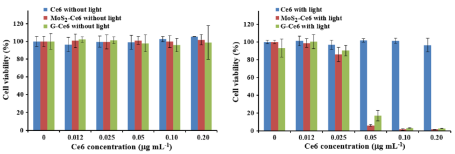 2D Materials为中科院大类一区和JCR一区期刊(当前影响因子为7.343),主要发表二维层状纳米材料相关的研究工作。课题组发表的研究论文(2D Materials, 2019, 6, 045035)报道了课题组在肿瘤光热联合治疗方面的研究进展。与手术、化疗、放疗等常规治疗方法相比,光热联合疗法具有创伤小、毒性低、选择性好、可重复治疗等优点,因而受到广泛的关注。肿瘤光热疗法,多以纳米材料为药物载体,将光敏剂(或肿瘤药物)输送到肿瘤部位。在光照的作用下,光敏剂吸收光子能量,产生活性氧化物种,从而杀死肿瘤细胞。同时,纳米药物载体将光能转化为热能,亦可杀死肿瘤细胞,实现光热联合治疗。刘刚课题组联合京都大学Naoki Komatsu教授课题组,通过液相剥离,一步法制备了二维层状材料(石墨烯及MoS2)与光敏剂(Ce6, Pa, bPa)的复合物。此类复合物具有载药量高、水中分散性好等优点。在用于肿瘤光热联合治疗时,0.05μg/mL的药物浓度即可杀死90%以上的肿瘤细胞,该效率比使用其他药物载体提高10倍以上。