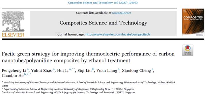 (通讯员赵玉辉)近日,世界知名出版社爱思唯尔(Elsevier)的学术期刊CompositesScience and Technology(中科院一区,IF:6.309)报道了bw必威西汉姆联官方网站特聘教授李鹏程课题组在碳纳米管/聚苯胺复合热电材料的最新研究进展,题为“Facilegreen strategy for improving thermoelectric performance of carbonnanotube/polyaniline composites by ethanol treatment”。这是该课题组继2019年在知名期刊Organic Electronics(JCR一区,IF:3.495)上发表题为“Modulatingcarrier transport for the enhanced thermoelectric performance of carbonnanotubes/polyaniline composites”后的又一重要研究进展。