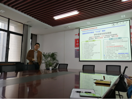 (通讯员:文静)为进一步做好2021年国家自然科学基金课题的申报工作,帮助学院青年教师提高基金申请书的质量。11月18日下午14:00,材料学院在A314会议室召开了国家自然科学基金课题申报动员会暨辅导报告会。会议邀请湖北大学材料科学与工程学院副院长施德安教授作报告,材料学院院长江学良主持会议,副院长姚军龙、熊礼威以及学院有意向申报2021年国家自然科学基金的教师和博士后参加了会议。