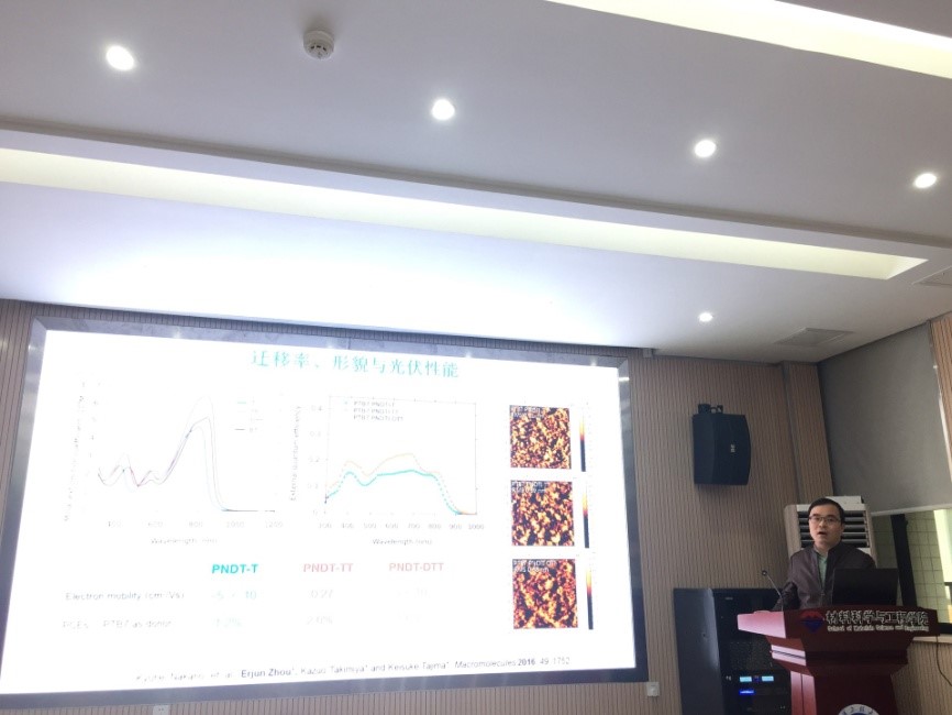 2018年11月22日上午,应材料科学与工程学院邀请,中国科学院化学所周二军研究员来bw必威西汉姆联官方网站参加“材苑讲坛(第8期)”,在材料科学与工程学院A326会议室做了题为“有机光伏电池受体材料的设计合成”的学术报告。材料科学与工程学院党委书记、院长刘治田教授主持并致欢迎词,材料科学与工程学院从事相关研究的师生参加了报告会,并与周二军研究员进行了深入交流。