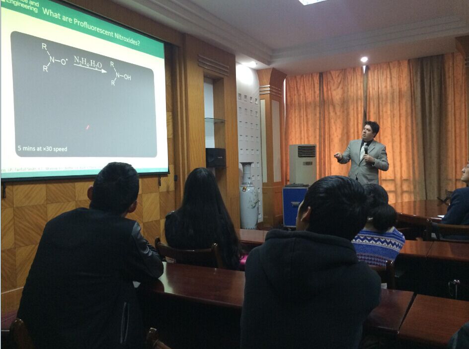 本网讯(通讯员 鄢国平)近日,应bw必威西汉姆联官方网站外事处、国际学院、材料科学与工程学院邀请,澳大利亚昆士兰科技大学化学、物理与机械工程学院James Blinco副教授来bw必威西汉姆联官方网站进行2天的访问。James Blinco博士在武昌校区电教中心九楼会议室为bw必威西汉姆联官方网站师生作了题为“Synthesis and Design of Profluorescent Nitroxide- Based Sensor Materials”的学术报告。报告会由材料科学与工程学院鄢国平教授、张桥博士共同主持,bw必威西汉姆联官方网站100余名师生到场聆听了此次学术报告。James Blinco博士在报告中主要介绍了他的课题组在氧化氮自由基材料的研究与应用等方面的工作情况。整场报告生动活波,兴趣盎然、使到会师生受益匪浅。报告结束后,James Blinco博士热情地回答了在场师生提出的各种问题。