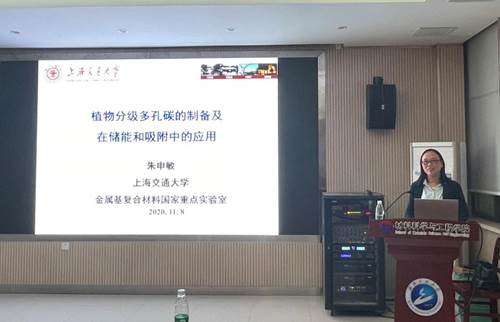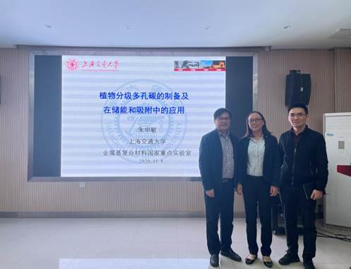 朱申敏教授在报告中主要介绍了植物多孔碳的制备及其在储能和吸附应用方面所取得的一系列科研进展。朱教授从锂离子电池电极的结构展开,重点阐述了植物多孔碳的分级多孔结构,以及多孔碳的石墨化处理方法,并详细介绍了植物多孔碳在锂电池电极和重金属离子吸附方面的应用。整场报告内容新颖、见解独特,引起了在座师生浓厚的兴趣。学术报告结束后,朱教授热情回答了在场师生提出的学术问题,并与师生进行了深入的交流。随后,朱教授参观了学院部分老师的实验室,同时就合作开展的课题与相关研究生进行了座谈。
