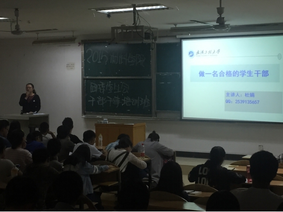 团委副书记杜娟老师以《做一名合格的学生干部》为主题进行了培训。她指出,做一名合格的学生会干部,首先要有良好的自我定位与基本素质。其次是多奉献,常锻炼,乐于助人,积极参加校园活动。杜娟老师同样强调了计划,组织,指挥,控制能力及思想政治,心理身体,行为道德素质,还有安全,责任团队合作,自我形象,服务奉献,平衡大局意识对学生会干事的重要性。最后杜娟老师以“简历是走出来的”为结束语,细心教导大家唯有丰富的大学经历才会使我们踏过前进道路上的阴霾。