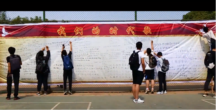 三行情书活动中,同学们在三句话的紧凑空间内,记录下自己对30年后的自己和30年后的祖国的希望与祝福。并于9月26日在学校篮球场、9月27日在材料楼进行悬挂展出。