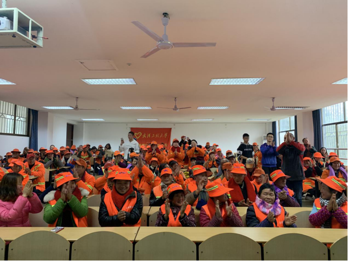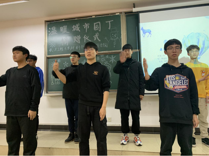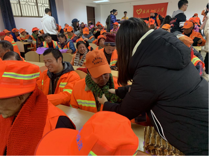 本网讯(通讯员熊兆胜男)冬日送暖,材料科学与工程学院“温暖城市园丁”志愿服务活动如火如荼,从招募志愿者、采购毛线团、组织围巾编织培训到男生女生们利用课余时间,历时一个多月亲手织成围巾140余条。12月30日,“温暖城市园丁”围巾捐赠仪式在流芳校区L1208教室举行。学院党委副书记肖平、东湖高新区市容科郑长银、学院代理团委书记熊兆胜男、高新区100余名环卫工人代表和学院青年志愿者协会全体成员参与了捐赠仪式。