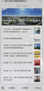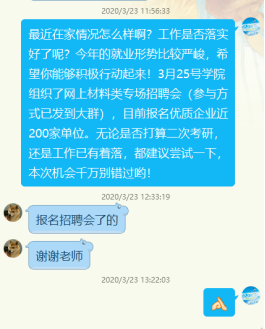 为方便同学们线上求职,学校就业指导中心积极发布就业信息并组织全校空中双选会,学院全力配合并动员毕业生积极报名,同时要求毕业生务必关注学校就业指导中心微信公众号。学院为同学们推荐求职相关法律维权等公众号,引导毕业生保护自身权益。