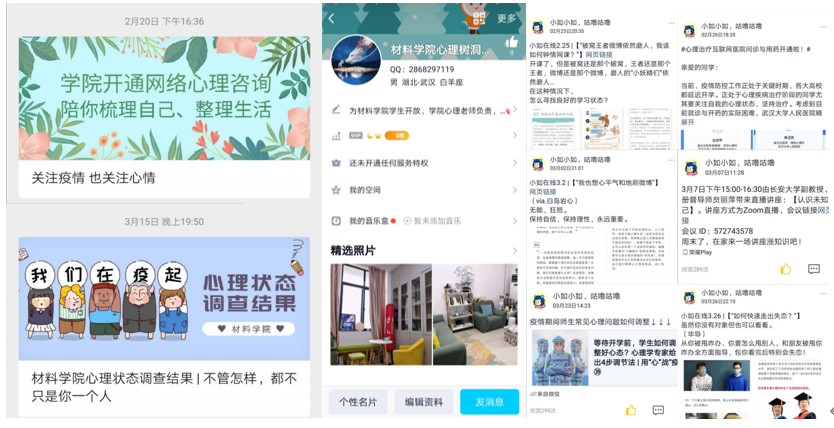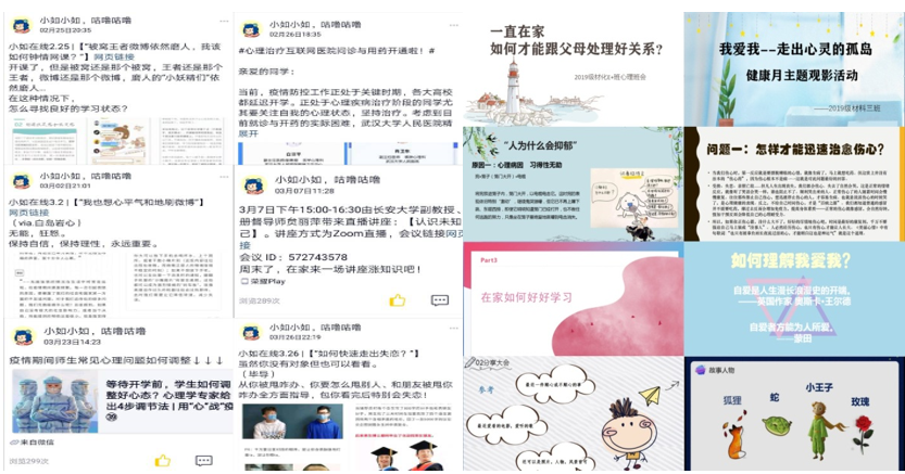 其次,心理疏导、心理咨询做到线上线下相结合。学院如是心理协会官Q“小如”接收同学们的留言并进行回复,充当同辈心理咨询师的角色;学院心理树洞QQ由学院专职心理老师负责,进行一些答疑和咨询,在疫情期间发挥了线上优势,进行网络咨询四十余次。同时,在心理健康活动成果上尝试线上线下相结合,学院开展的心理健康“九个一”系列活动当中,开展线下观影之后在线上进行观后感分享,开展线上读书打卡与读后感分享之后在线下进行更深入的读书沙龙。