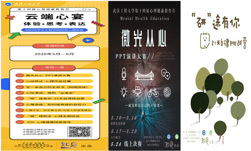 从疫情开始初期,他们一方面参与疫情防控、线上课程学习等活动,另一方面在学院如是心理工作室史梦璐老师指导下,开展疫情下心理健康调查、定期推出抗疫“线上学习”与“情绪调适”等推文、开展“拯救无聊计划”、组织策划协调心理健康教育月系列活动……这群刚进入学校一年或者两年的学生心理健康教育骨干是撑起了这场活动平稳运行的支架。作为学校心理健康教育月重要的承办单位之一,材料学院多次获得优秀组织单位等荣誉。而这些成绩都要归功于学院在不断探索中形成的心理育人“123”工作体系。