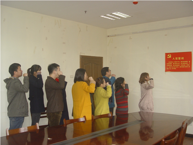 学院办公室党支部书记熊彩云老师通报了党员到会和本月党费缴纳情况,随后,奏唱国歌,由学院党委副书记李佳领誓,办公室支部全体成员重温入党誓词,集体诵读党章。