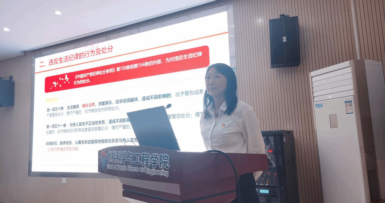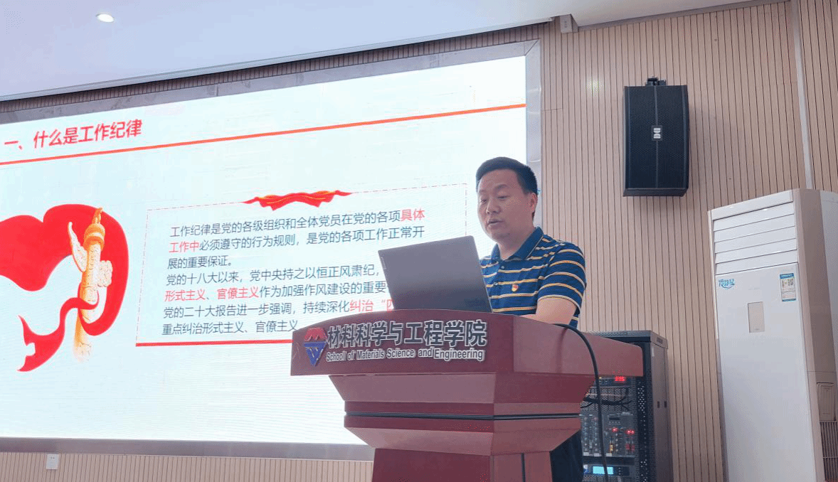 (通讯员 田明华)5月30日下午,材料学院在A326报告厅举行党纪学习教育党委委员讲纪律党课。学院党委委员,教工和学生党支部书记以及授课党委委员所联系的学生党支部党员参加学习,会议由学院院长江学良主持。