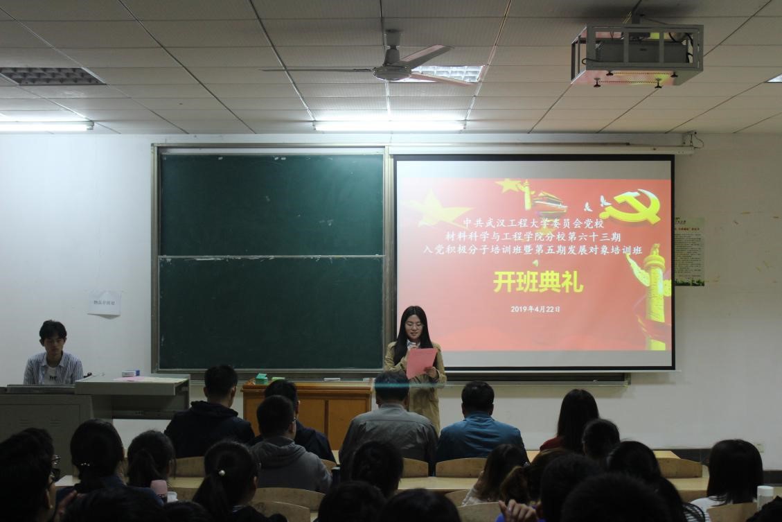 (通讯员高梦雅)4月22日中午12点30分,中共武汉工程大学委员会党校材料科学与工程学院分党校第63期入党积极分子培训班暨第5期发展对象培训班开班典礼在流芳校区2105教室举行。学院党委常务副书记李国林、学院党委副书记肖平以及学院全体辅导员出席开班典礼。开班典礼由本期党校培训班班主任高梦雅主持。