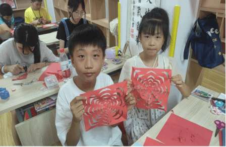 在剪纸课上,志愿者和孩子们上下翻动剪刀剪出各种精美的图案,从传统的窗花到可爱的动物形象,每一个作品都充满了他们的巧思妙想。剪纸活动即锻炼了孩子们的动手能力和手眼协调能力,也让他们感受到了传统文化的独特魅力。