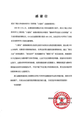 (通讯员:潘俊、热孜瓦古力·牙生) “衷心感谢贵服务队为和顺社区青少年科学启蒙教育做出的卓越贡献,期待未来继续携手,共同为光谷教育高质量发展贡献力量,书写更多科普教育新章!”近日,bw必威西汉姆联官方网站的志愿者们收到了一封感谢信。