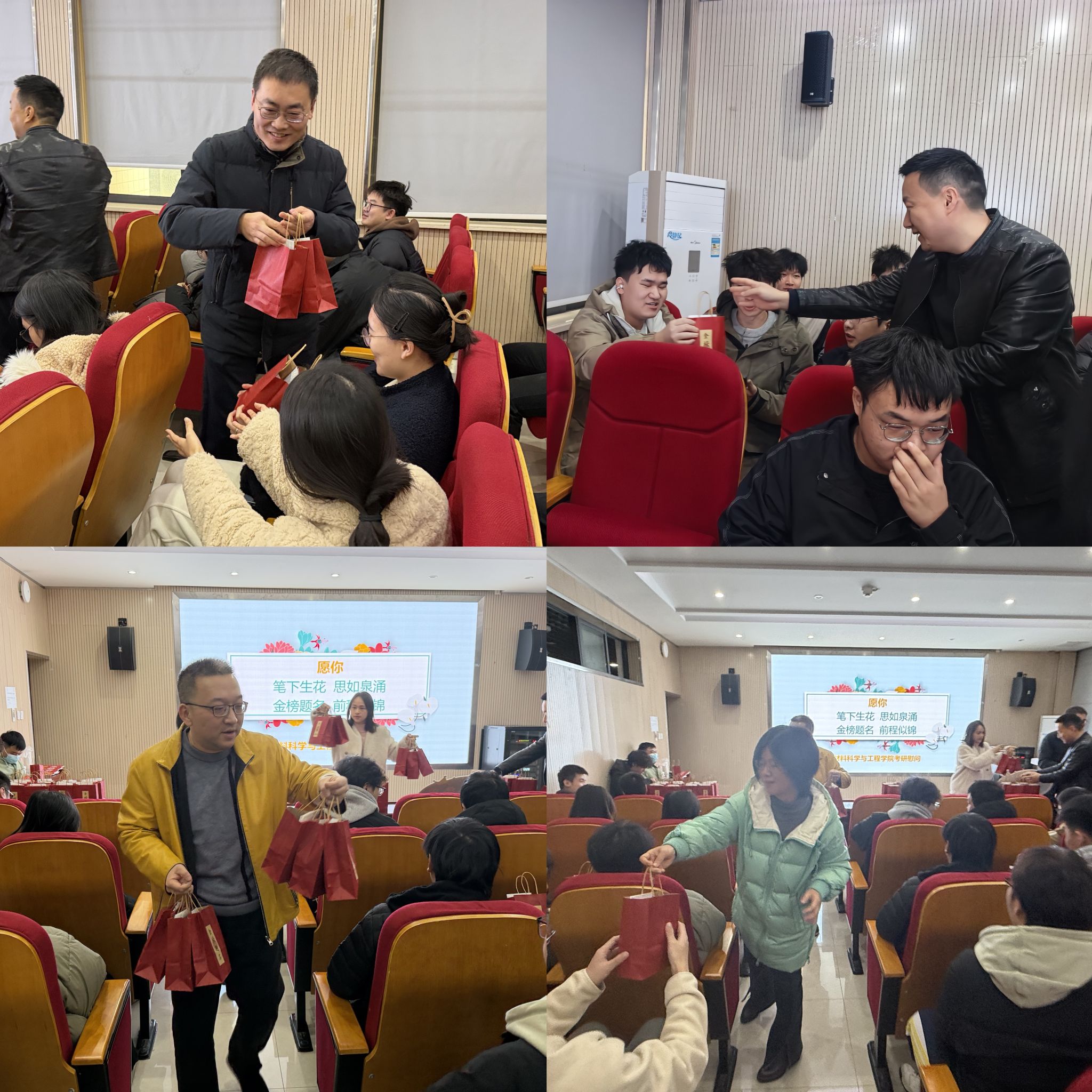 随后,老师们为正在备战的考研学子们送上一份份饱含温暖的“关怀大礼包”。礼包中包含寓意“笔下生辉”的实用文具,让人感觉“暖暖的,很安心”的暖宝宝贴和医用口罩,以及一份别具心意的“快乐肥宅水”,寄托了老师们对考研学子放松心情、一鼓作气的暖心鼓励。每一件大礼包都凝聚着学院对考研学子细致入微的关怀与美好祝愿,祝愿同学们金榜题名,前程似锦。