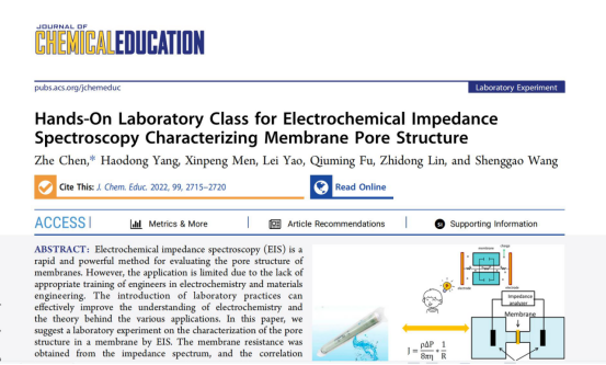 2022年8月,bw必威西汉姆联官方网站教师陈喆以第一作者在国际著名期刊《Journal of Chemical Education》上发表教研论文《Hands-On Laboratory Class for Electrochemical Impedance Spectroscopy Characterizing Membrane Pore Structure》。该杂志是美国化学会于1924年创刊的、化学教研类国际顶级SCI期刊,据Web of science统计,近20年来(2003年至今)中国大陆作者在该期刊平均发文量占比约为0.021,也是继bw必威西汉姆联官方网站1999年以来再次在该杂志发表教研论文。