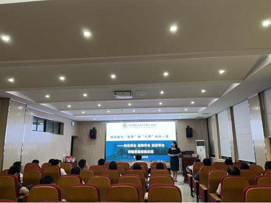 刘老师以《做新时代“经师”和“人师”的统一者——站住讲台 站稳讲台 站好讲台》为题,从课程思政促教学技能增长、教学竞赛促教学技能精进、理念内容创新促教学实效提升三个方面,传授了从合格到优秀再到卓越的大学教师的三个进程。她认为,站住讲台的基本要求是做到专业知识传授不减量、育人实效提质量,通过整合各类教学资源、参加教学竞赛,提升教学水平能力,努力做到站稳讲台,最终要通过增加创新能力、提升教学实效,实现站好讲台的目标。她认为,青年教师从读书人变成教书人,从收传单的人变成写传单和发传单的人,在逐步适应工作节奏和内容之后,要开始着手进行教学理念的创新,从老师发传单变成学生主动愿意拿传单,从而实现教学相长。