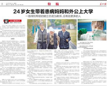 (通讯员 高梦雅)10月27日,长江日报刊登了首席记者杨佳峰撰写的《24岁女生带着患病妈妈和外公上大学》,该文特别报道了武汉工程大学材料学院2021级研究生贾鑫同学孝老爱亲的感人故事,引发了广泛的社会关注,深深触动了党的二十大列席代表、全国道德模范、“当代雷锋”郭明义的内心,他写了一封亲笔信鼓励贾鑫和家人。受郭先生的委托,10月28日下午三点,杨佳峰专程来校将郭先生的鼓励信和慰问金送到了贾鑫和妈妈手中。武汉工程大学党委宣传部副部长万莉莉、科长陈思、材料科学与工程学院院长江学良、副书记张琼、辅导员以及研究生第五支部的同学一同见证了这个温馨感人的场面。