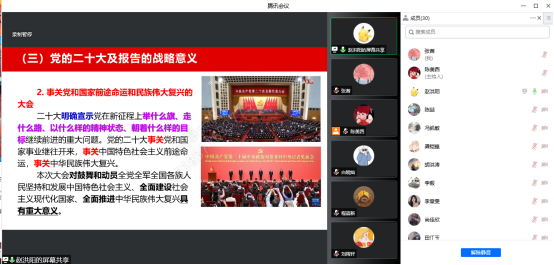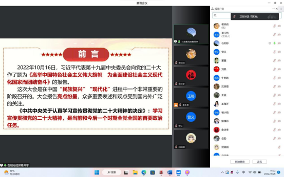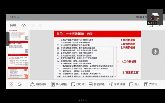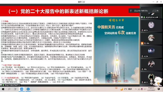 12月1日下午2:30,宣讲团成员、材料学院党委书记王涛在学校微特“一站式”学生社区开展了宣讲,学院全体辅导员、无机非金属系党支部、本科生第一党支部、本科生第六党支部、研究生第五党支部的全体党员采用线上线下相结合的方式参加宣讲会。