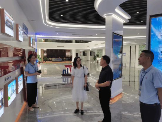 三赢兴光电科技股份有限公司党委第一书记刘建斌、人力资源与行政管理服务部经理毛冬飞、招聘专员凡慧敏热情接待了张琼一行,并一同参观了公司办公楼一楼展厅的文化墙、产品陈列柜、专利墙、荣誉墙和COB、TPD生产中心。在参观过程中,刘书记为大家详细介绍了公司的发展历程、企业文化、科研能力以及发展前景。