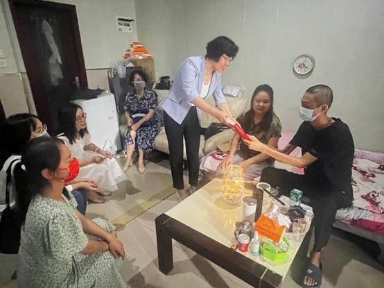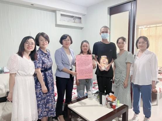 (通讯员张茜、安佰谦)7月23日上午,武汉工程大学党委副书记郑丹凤、学工部副部长徐迪迪、材料学院党委副书记张琼、2022级辅导员张茜、2023级辅导员安佰谦、环生学院博士研究生夏静一行赴江汉区新华天瑞国际1006谭学谦与妈妈临时租住的“家”中,看望骨髓移植恢复期的材料学子谭学谦及家人。