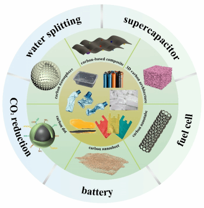 塑料污染正在引发全球环境危机,促使人们加大回收和升级利用的力度,以释放其隐藏的价值。将塑料废物增值转化为碳基材料并且应用在电化学能源存储和转化是一种有吸引力的选择。本团队从碳基材料中所含元素的角度,综述了现有的塑料废弃物向碳量子点、碳纳米球、碳纳米片、碳纳米管、三维多孔碳、碳基复合材料等碳基电极材料的转化过程,以及基于结构特征的碳基电极材料的电化学能源领域的应用。最后,提出了塑料废弃物可控升级回收为电化学碳材料的挑战和前景。该综述为探索废弃塑料能源升级的先进技术提供了启示,为实现塑料价值链管理的可持续性和盈利性提供了前瞻性思路。该工作发表在中科院一区top期刊Chemical Engineering Journal上。