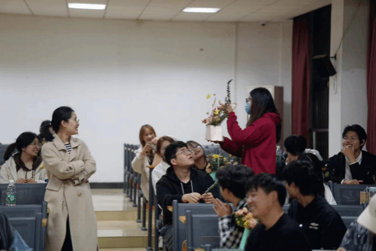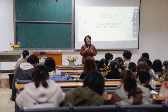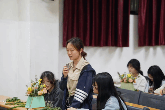杨雪给同学们介绍了插花的起源和历史,用大量图片、例子讲解了东西方在插花花材、花器、造型方面的差异,引导同学们从插花文化这一个小切口树立文化自信。