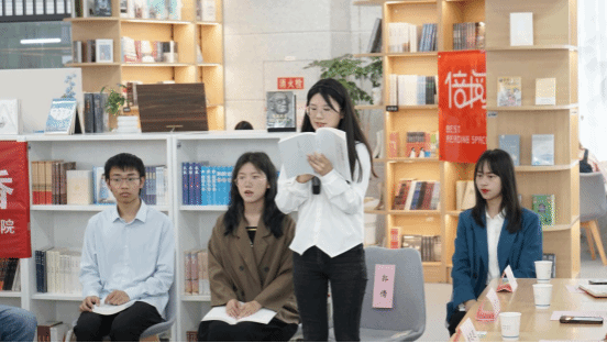 在读书分享环节,材料学院龚旭昕、黄如意、郭倩等3名同学依次为大家领读了《习近平故事》一书中《学而有思》、《30里借书》、《信仰的力量》等三个生动的小故事,引领大家感受中华文化智慧的结晶和强大的中国力量。