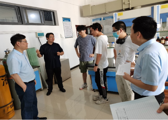 对照学校及学院相关安全管理规定,检查小组深入学院各实验室,对实验室仪器设备、危化品管理以及实验室环境卫生情况进行了全面检查。检查过程中,书记王涛指出,要加强对实验室仪器设备的管理,高温设备周围必须留有一定的散热空间,严禁存在易燃、易爆、易挥发化学品和纸板、泡沫、塑料等易燃物品;进入实验室人员必须穿实验服,禁止将实验服带到休息区域。院长江学良强调,实验室需加强安全台账记录工作,特别是危化品流动台账、实验室日志记录等工作。